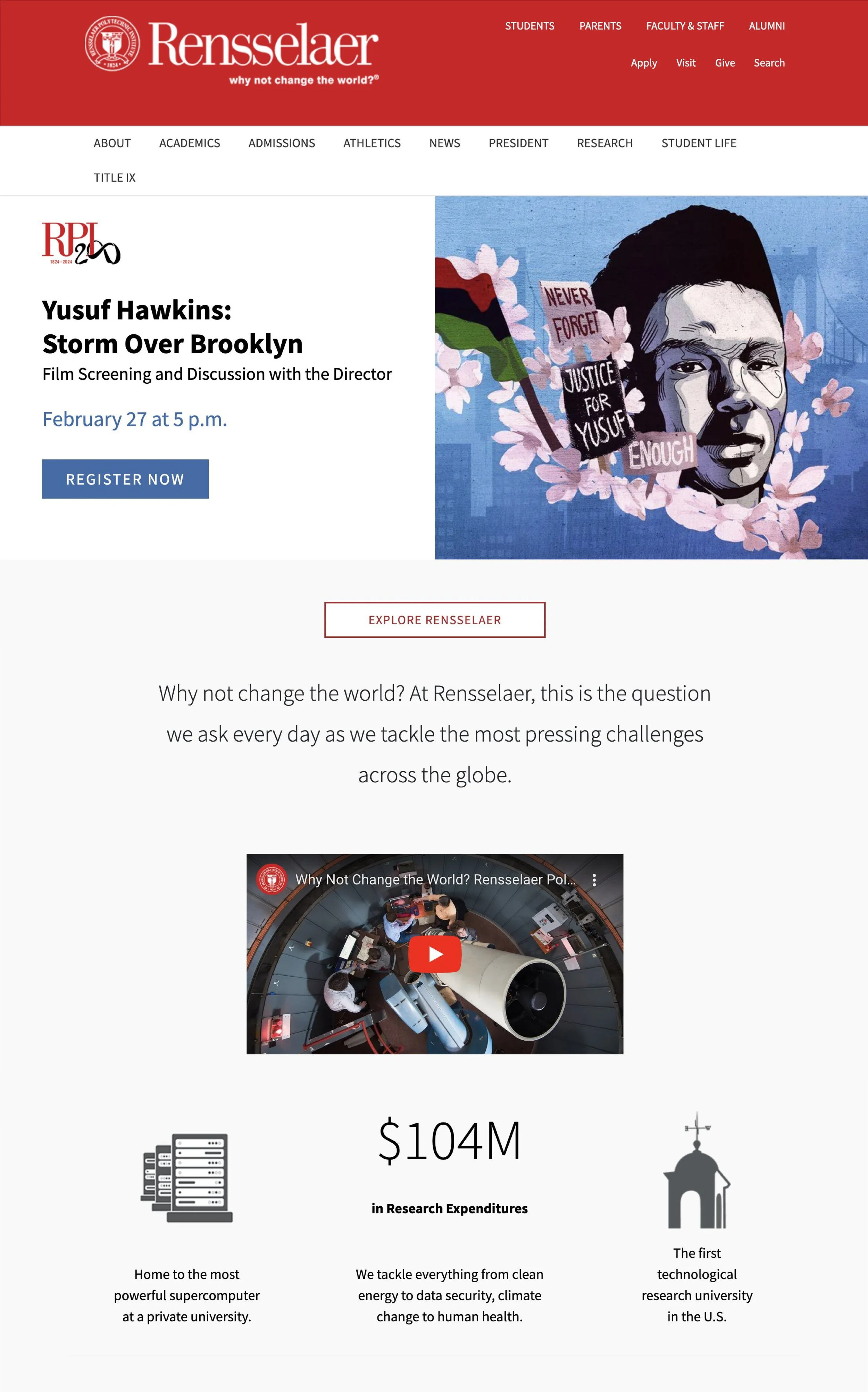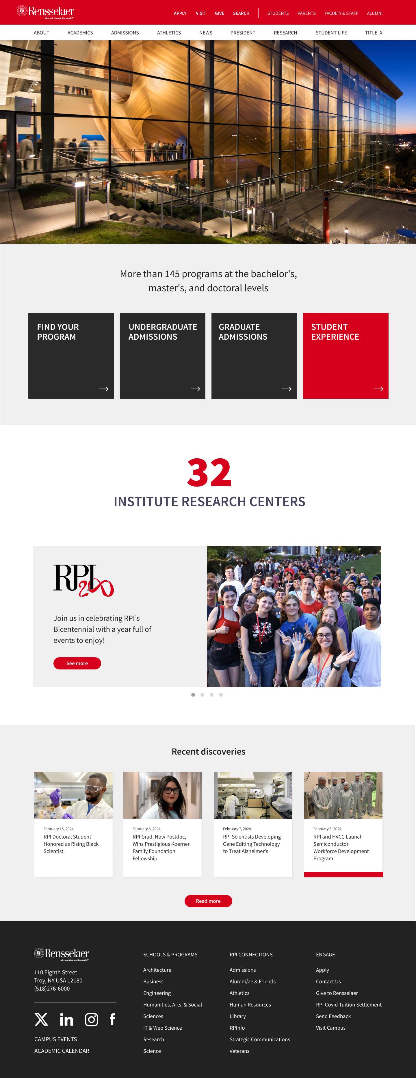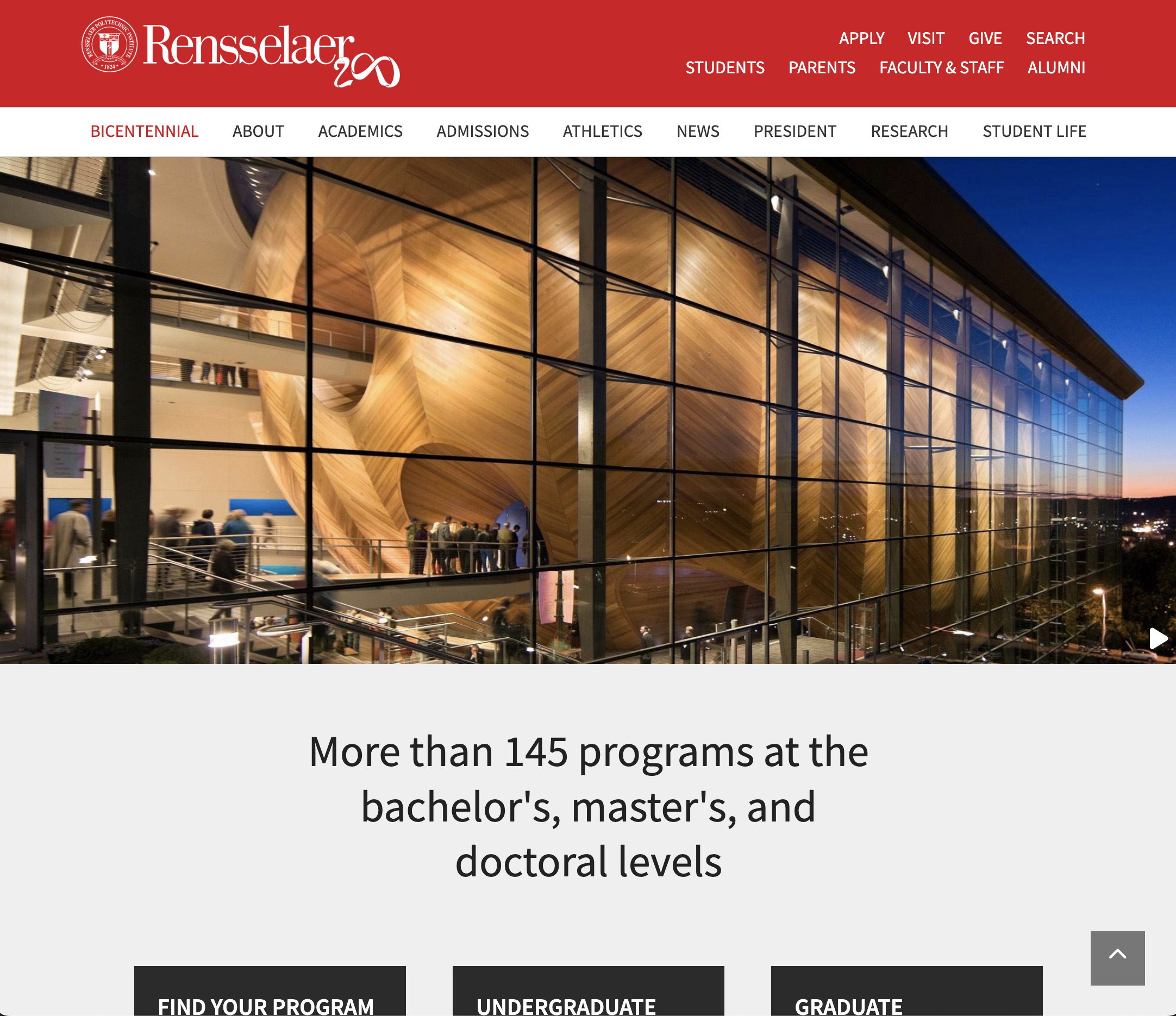 Rensselaer Polytechnic Institute (RPI) is the oldest engineering school in America, and as they celebrate their bicentennial, I worked with them to refresh their official homepage where students, staff, and alums can quickly navigate to pre-existing pages.